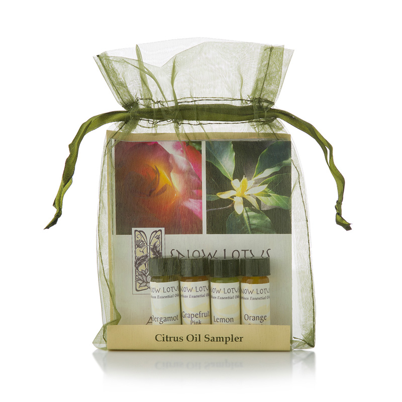 The Snow Lotus Citrus Essential Oil Sampler contains one each of the following oils in 4 ml glass bottles, beautifully packaged in an organza bag:
